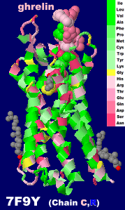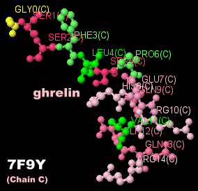グレリンのアミノ酸配列(28残基;7f9yでは太字の15残基のみ)