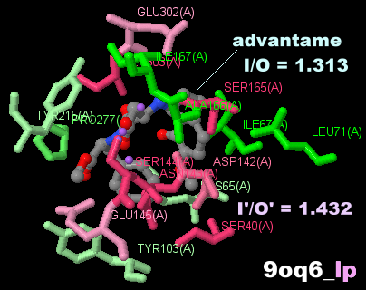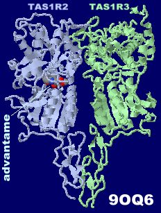 左から アスパルテームと同誘導体アドバンテーム,アドバンテーム(advantame)結合9oq6とPDBsumデータ