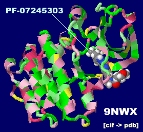 Pan-TRKキナーゼ阻害剤PF-07245303(アトピー性皮膚炎治療薬候補)が結合したチロシンタンパク質キナーゼITK/TSK 9nwxとPDBsumデータ