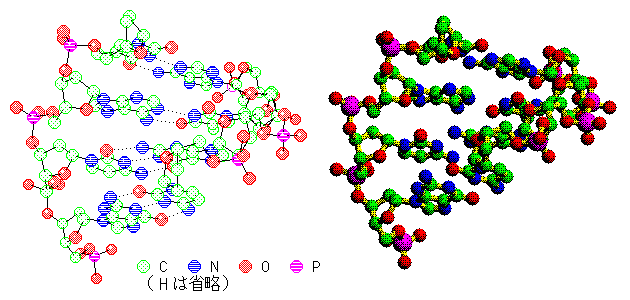 分子モデリングソフトウェアによるDNA分子の表示例(水素原子は省略).左は CAMD-I plus(矢野米雄・本間善夫),右は MODRAST(中野英彦)による.分子データファイルは同一であり,原子座標という数値データをグラフィックにした例といえる.DNAは MOLS(笹田義夫)で組み立てた後に,ファイル変換した.
