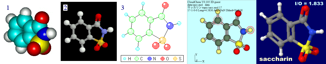 いろいろな分子モデル表示形式例:サッカリン(自作分子データ変換プログラム利用);【1】分子ソフト HyperChem(Hypercube社),【2】インターネットWWW上の分子表示 plug-in“ChemscapeChime”(MDL社),【3】CAMD-I plus(矢野・本間),【4】Winmostarクラウドによる(本間作成分子データ),【5】Jmol,【6】サッカリン結合タンパク質例4rivのPDBsumデータ ※I/O値・I'/O'については有機概念図参照