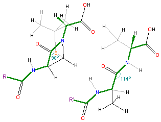 ペニシリン骨格(上左;下はその一例,ペニシリンG)とD-アラニル-D-アラニンの構造(上右;下はR'がHの場合)の重ね合わせ。上図の緑色部分が類似している。