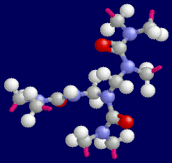 [ ]内が繰り返し単位であり,n は繰り返しの数で高分子の作り方によって異なる上に,分子1本1本の繋がっている数も異なっている場合が普通である(酵素やDNAなど,機能の高い生体高分子は繰り返しの順序が決まっているので,各々で分子長・分子量は定まっている)。[ ]の両脇の“−”はさらに隣の繰り返し単位に繋がっていることを示している。そこで,Chimeで高分子を表わす場合は,この“−”の部分を“LP”(lone pair)原子として組立て,3次元表示した時の表示色が濃いピンクになるようにした。以下がPMMAの場合である。